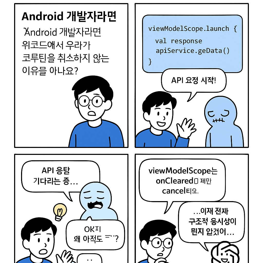 Android에서 Kotlin Coroutines를 제대로 쓰기 위해 꼭 알아야 하는 개념 중 하나가 바로 "코루틴 취소"입니다. 특히 ViewModel이나 Activity 생명주기에 따라 적절한 시점에 코루틴을 종료하지 않으면, 앱은 곧 메모리 누수나 예외의 늪에 빠지게 됩니다.
