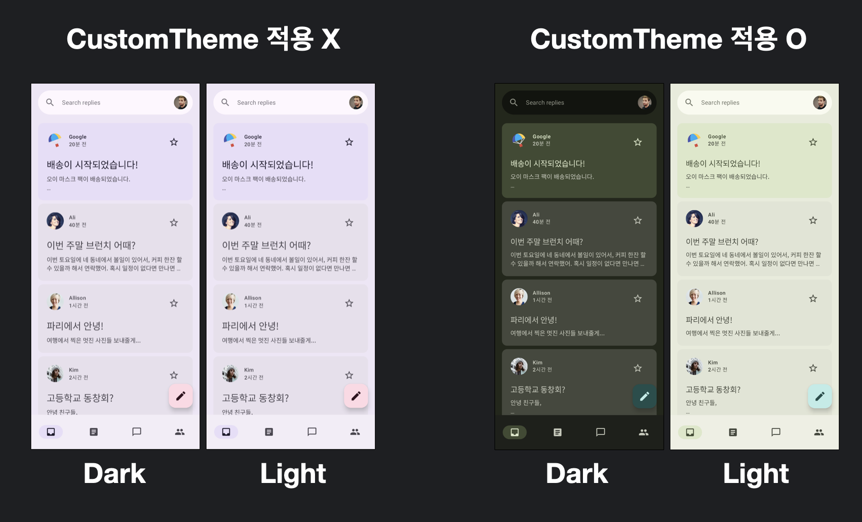 아래처럼 Theme 레벨에서 colorScheme을 분기함으로써, 개별 Composable에서는 다크 모드 여부를 전혀 신경 쓰지 않아도 된다.